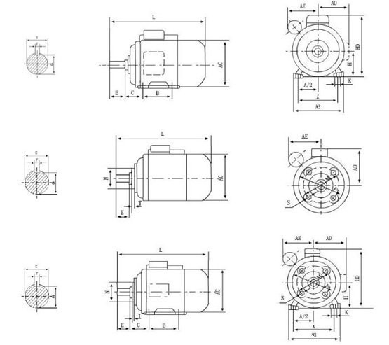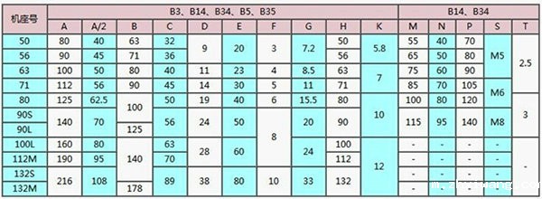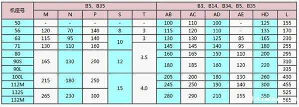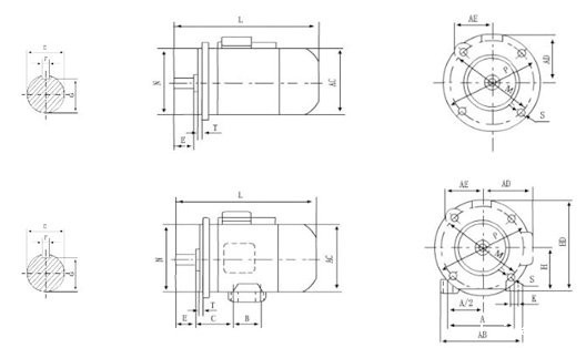 B14型 - - 机座无底脚,端盖上有小凸缘,轴伸在凸缘端。