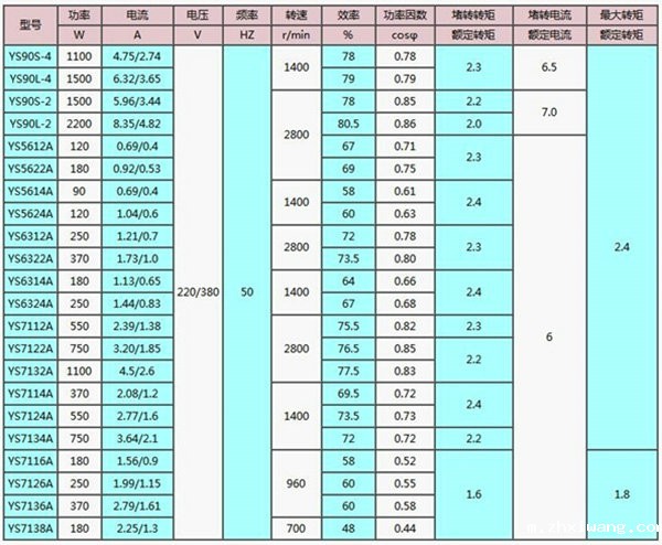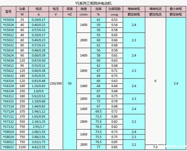 YS系列三相异步电动机具有节能、噪音低、振动小、起动转矩大等特点。防护等级为IP44,采用B级绝缘。电压为220/380V,频率为50Hz,该产品广泛应用于各种中小 型机床,医疗机械,家用电器,电子仪器,食品机械等设备。